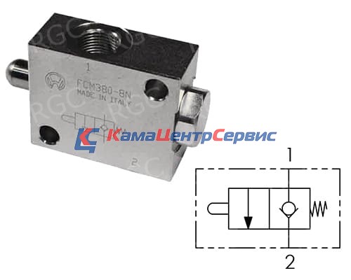 Клапаны ограничения перемещения FCM120N (нормально закрытый) используется для обеспечения поочередной работы двух гидроприводов, включая подачу рабочей жидкости в гидравлический контур. Также возможно использование в качестве концевого клапана для разгрузки напорной линии в бак. При нажатии на кнопку поток рабочей жидкости свободно движется от P к A.
